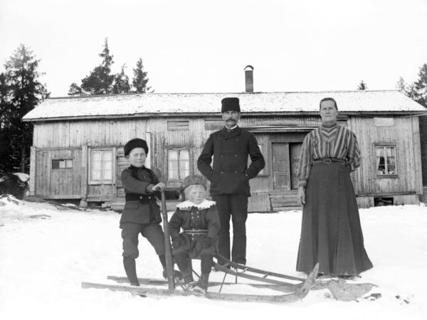 "Familjen From framför huset Lönns i Djursta. Huset stod strax väster om huset där Margareta Nordborg nu bor. Pojken S.O. From håller i en sparkkälke där pojken Andreas From sitter. Föräldrarna Olle och Anna From står bakom"